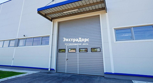 Серые промышленные противопожарные ворота с окнами