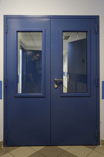 Противопожарная алюминиевая дверь синего цвета в Можайске