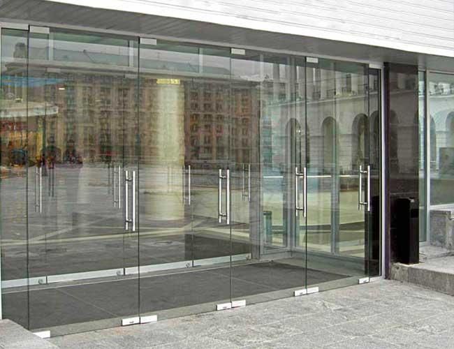 Противопожарная безрамная дверь со стеклом в торговый центр в Можайске